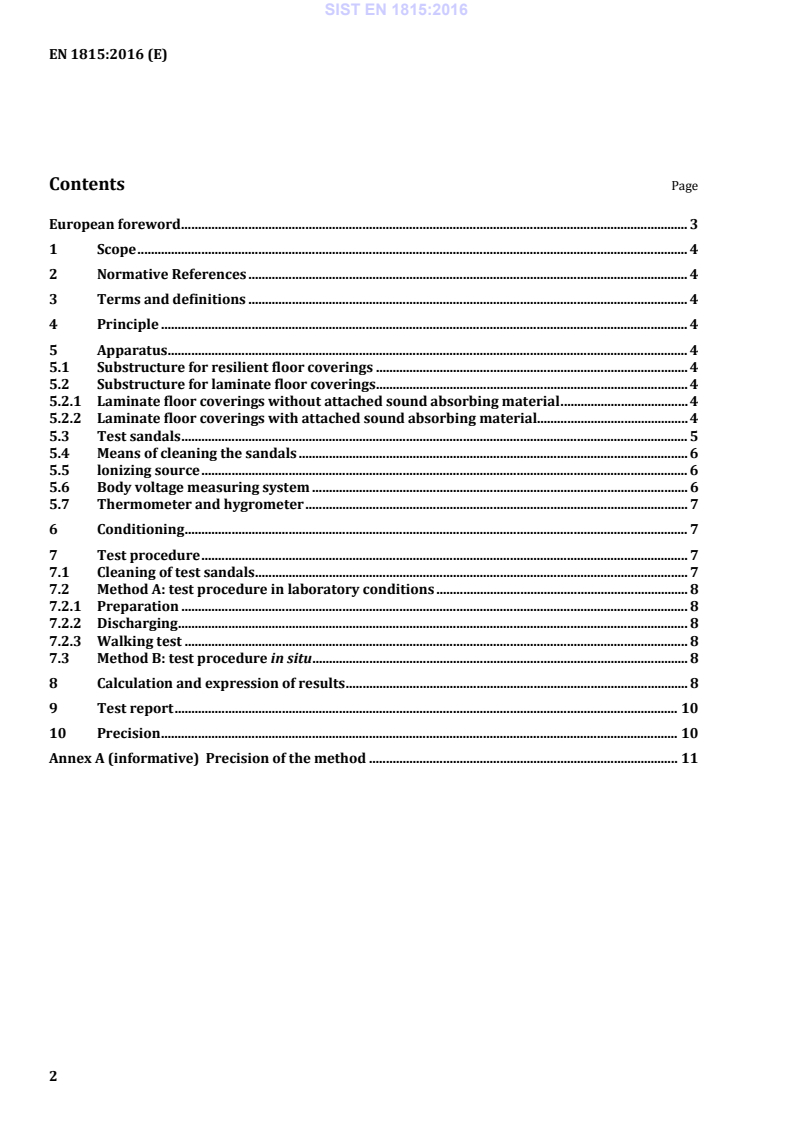 EN 1815:2016 is a standard published by the European Committee for Standardization (CEN). Its full title is "Resilient and laminate floor coverings - Assessment of static electrical propensity". This standard covers: This standard specifies a method for determining the body voltage generated when a person wearing standardized footwear walks on a resilient or laminate floor covering. The test method can be used under laboratory conditions as well as in situ.
