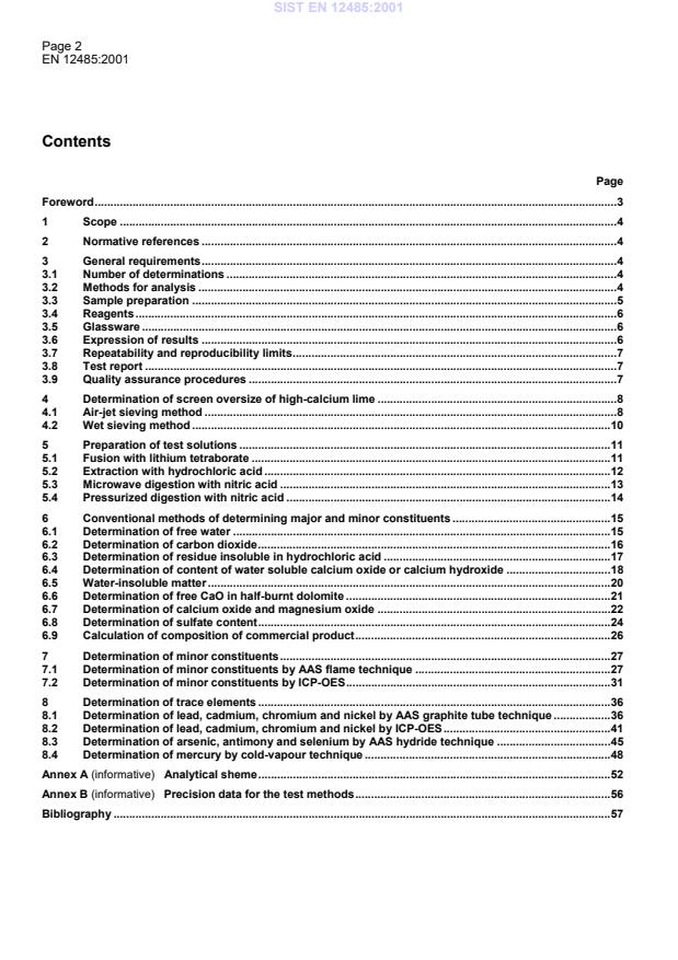 Page 2EN 12485:2001ContentsPageForeword.31Scope.42Normative references.43General requirements.43.1Number of determinations.43.2Methods for analysis.43.3Sample preparation.53.4Reagents.63.5Glassware.63.6Expression of results.63.7Repeatability and reproducibility limits.73.8Test report.73.9Quality assurance procedures.74Determination of screen oversize of high-calcium lime.84.1Air-jet sieving method.84.2Wet sieving method.105Preparation of test solutions.115.1Fusion with lithium tetraborate.115.2Extraction with hydrochloric acid.125.3Microwave digestion with nitric acid.135.4Pressurized digestion with nitric acid.146Conventional methods of determining major and minor constituents.156.1Determination of free water.156.2Determination of carbon dioxide.166.3Determination of residue insoluble in hydrochloric acid.176.4Determination of content of water soluble calcium oxide or calcium hydroxide.186.5Water-insoluble matter.206.6Determination of free CaO in half-burnt dolomite.216.7Determination of calcium oxide and magnesium oxide.226.8Determination of sulfate content.246.9Calculation of composition of commercial product.267Determination of minor constituents.277.1Determination of minor constituents by AAS flame technique.277.2Determination of minor constituents by ICP-OES.318Determination of trace elements.368.1Determination of lead, cadmium, chromium and nickel by AAS graphite tube technique.368.2Determination of lead, cadmium, chromium and nickel by ICP-OES.418.3Determination of arsenic, antimony and selenium by AAS hydride technique.458.4Determination of mercury by cold-vapour technique.48Annex A (informative)