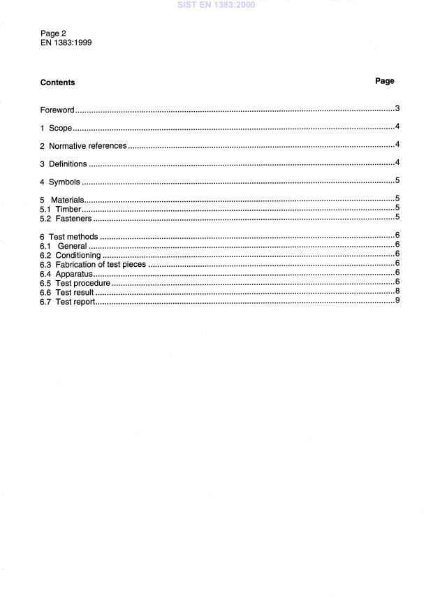 EN 1383:1999 is a standard published by the European Committee for Standardization (CEN). Its full title is "Timber structures - Test methods - Pull through resistance of timber fasteners". This standard covers: This European Standard specifies the test method for determining the resistance of timber to the head pull through of timber fasteners. The test method applies to all types of nails, screws and staples.