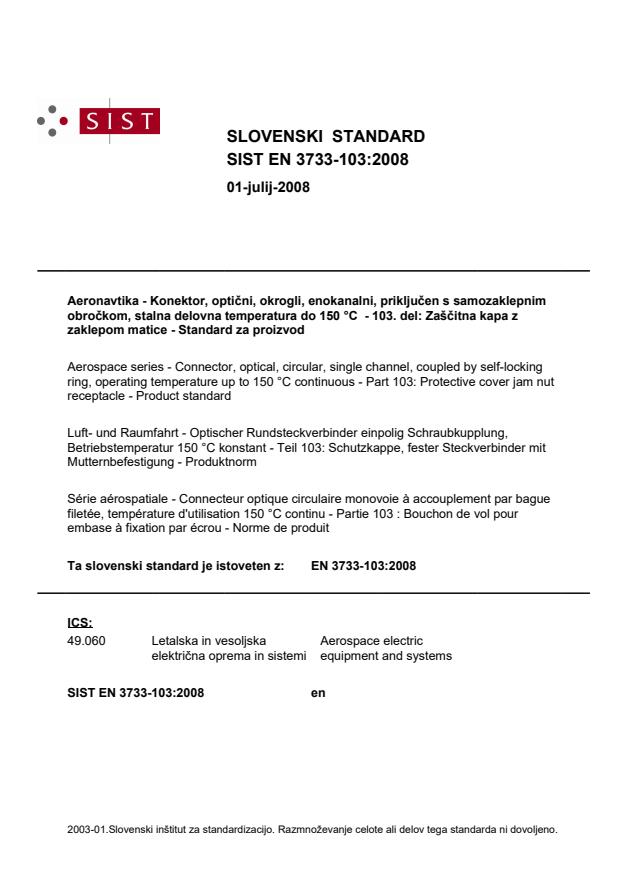 EN 3733-103:2008 is a CEN product standard in the Aerospace series that specifies the characteristics of protective covers for single-channel fibre-optic jam nut receptacle connectors rated for continuous operation up to 150 °C. The standard defines required materials, mass limits, and the interface relationships to companion product and technical specifications. It is intended to ensure reliable protective performance and interchangeability in aerospace electrical and optical systems.
