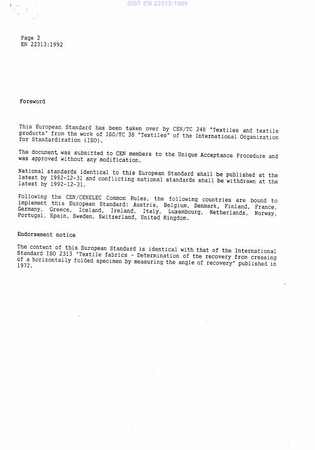 EN 22313:1992 is a standard published by the European Committee for Standardization (CEN). Its full title is "Textile fabrics - Determination of the recovery from creasing of a horizontally folded specimen by measuring the angle of recovery". This standard covers: Creases in textile fabrics diminish at varying rates on the removal of the creasing forces. The magnitude of the crease recovery angle is an indication of the ability of a fabric to recover from accidental creasing. The results obtained by this method for textile fabrics of very different kinds cannot be compared directly.