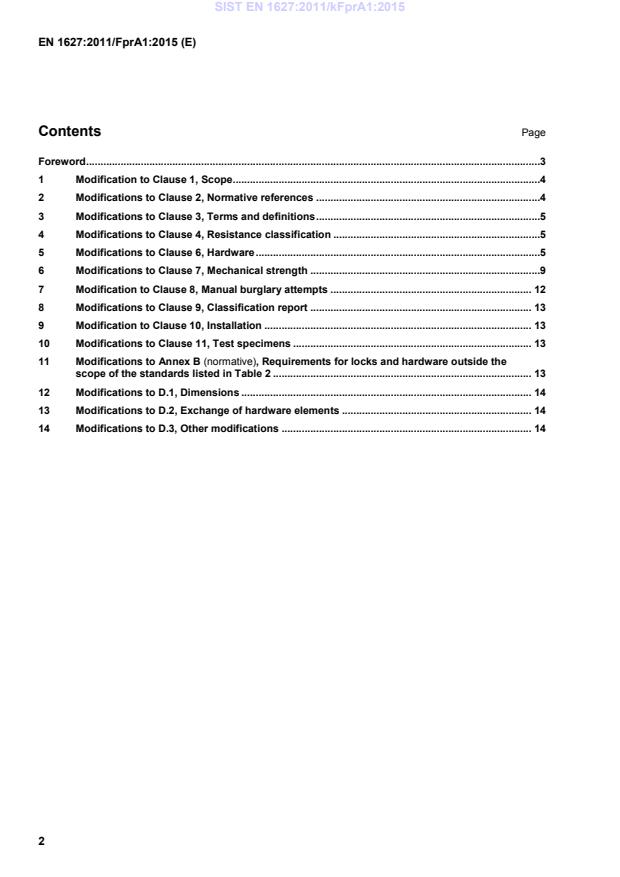 EN 1627:2011/FprA1 is a draft published by the European Committee for Standardization (CEN). Its full title is "Pedestrian doorsets, windows, curtain walling, grilles and shutters - Burglar resistance - Requirements and classification". This standard covers: This European Standard specifies requirements and classification systems for burglar resistant characteristics of complete pedestrian doorsets, windows, curtain walling, grilles and shutters. Hardware is a component on the products and cannot be classified as such according to this standard. It is applicable to the following means of opening: turning, tilting, folding, turn-tilting, top or bottom hung, sliding (horizontally and vertically), pivoted and rolling as well as fixed constructions. It also covers products that include items such as letter plates or ventilation grilles. It specifies requirements for the burglar resistance of a construction product (as defined in 3.1 of this standard). This European Standard does not apply to doors, gates and barriers, intended for installation in areas in the reach of persons, and for which the main intended uses are giving safe access for goods and vehicles accompanied or driven by persons in industrial, commercial or residential premises, as covered by EN 13241 1. This European Standard does not directly cover the resistance of locks and cylinders to attack with picking tools. It also does not cover precast concrete elements. It also does not cover the attack of electric, electronic and electromagnetic operated burglar resistant construction products using attack methods that might defeat these characteristics. NOTE 1 The mechanical parts of electric, electronic and electromagnetic operated burglar resistant construction products can be tested in electrical powerless condition. NOTE 2 It is important that construction products that can be reached or driven through by vehicles are protected by appropriate measures such as barriers, extensible ramps, etc.