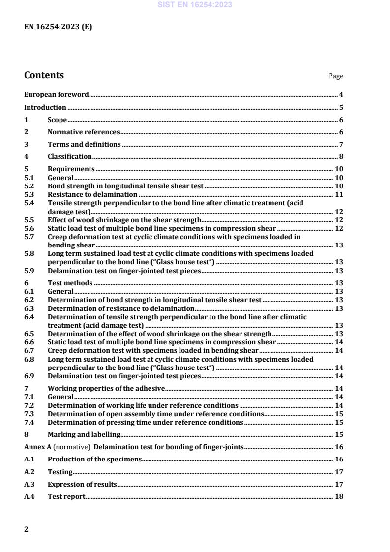EN 16254:2023 is a standard published by the European Committee for Standardization (CEN). Its full title is "Adhesives - Emulsion polymer isocyanate (EPI) for load-bearing timber structures - Classification and performance requirements". This standard covers: This document establishes a classification for emulsion polymer isocyanate (EPI) adhesives according to their suitability for use in load-bearing timber products in defined climatic exposure conditions, and specifies performance requirements for such adhesives for the industrial manufacture of load-bearing timber products only. The performance requirements of this document are applicable to the adhesives only, not to the timber products. This document does not cover the performance of adhesives for on-site gluing (except for factory-like conditions) or the production of wood-based panels, except solid wood panels, or modified and stabilized wood with considerably reduced swelling and shrinkage properties, e.g. acetylated wood, heat treated wood and polymer impregnated wood. This document is primarily intended for use by adhesive manufacturers and for use in timber products bonded with adhesives, to assess or control the quality of adhesives. This document only specifies the performance of an adhesive for use in an environment corresponding to the defined conditions. Such an adhesive meeting the requirements of this document for its type is adequate for use in load-bearing timber products, provided that the bonding process has been carried out according to an appropriate product standard.