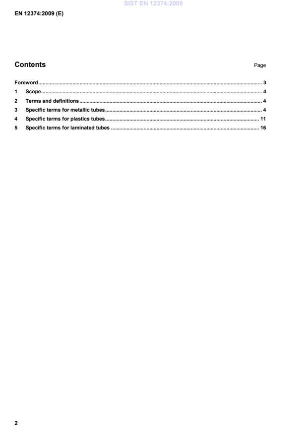 Foreword This document (EN 12374:2009) has been prepared by Technical Committee CEN/TC 261 “Packaging”, the secretariat of which is held by AFNOR. This European Standard shall be given the status of a national standard, either by publication of an identical text or by endorsement, at the latest by December 2009, and conflicting national standards shall be withdrawn at the latest by December 2009. Attention is drawn to the possibility that some of the elements of this document may be the subject of patent rights. CEN [and/or CENELEC] shall not be held responsible for identifying any or all such patent rights. This document supersedes EN 12374:1998. It is based on the professional recommendation of the European tube manufacturers association (etma). It consists of a series of simplified drawings with number codes which identify the various parts and which in turn refer to their definition in the three official languages of CEN. This document includes the following clauses: 2 General definitions; 3 Specific terms for metallic tubes (aluminium, tin); 4 Specific terms for plastics tubes; 5 Specific terms for laminated tubes. According to the CEN/CENELEC Internal Regulations, the national standards organizations of the following countries are bound to implement this European Standard: Austria, Belgium, Bulgaria, Cyprus, Czech Republic, Denmark, Estonia, Finland, France, Germany, Greece, Hungary, Iceland, Ireland, Italy, Latvia, Lithuania, Luxembourg, Malta, Netherlands, Norway, Poland, Portugal, Romania, Slovakia, Slovenia, Spain, Sweden, Switzerland and the United Kingdom. SIST EN 12374:2009