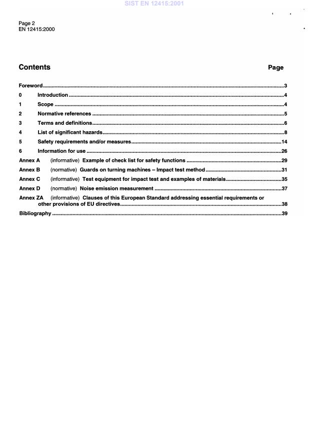 EN 12415:2000 is a standard published by the European Committee for Standardization (CEN). Its full title is "Safety of machine tools - Small numerically controlled turning machines and turning centres". This standard covers: This European Standard specifies the requirements and/or measures to remove the hazards and limit the risks on general purpose numerically controlled turning machines and turning centres which are designed primarily to work cold metal with no access to the work-zone during machining as defined in 3.1 and 3.2 and hereafter referred to as "machines". This Standard covers the significant hazards, listed in clause 4.