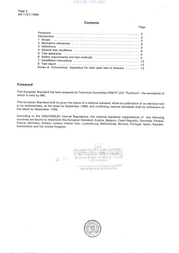 EN 1727:1998 is a standard published by the European Committee for Standardization (CEN). Its full title is "Domestic furniture - Storage furniture - Safety requirements and test methods". This standard covers: This European standard specifies safety requirements and test methods for all types of domestic storage furniture including those with glass in their construction. Safety depending on the structure of the building is not included e.g. the strength of wall hanging cabinets includes only the cabinet and its parts. The wall and the fixing in the wall is not included. It is intended to prevent serious injury through normal functional use, as well as misuse that might reasonably be expected to occur.