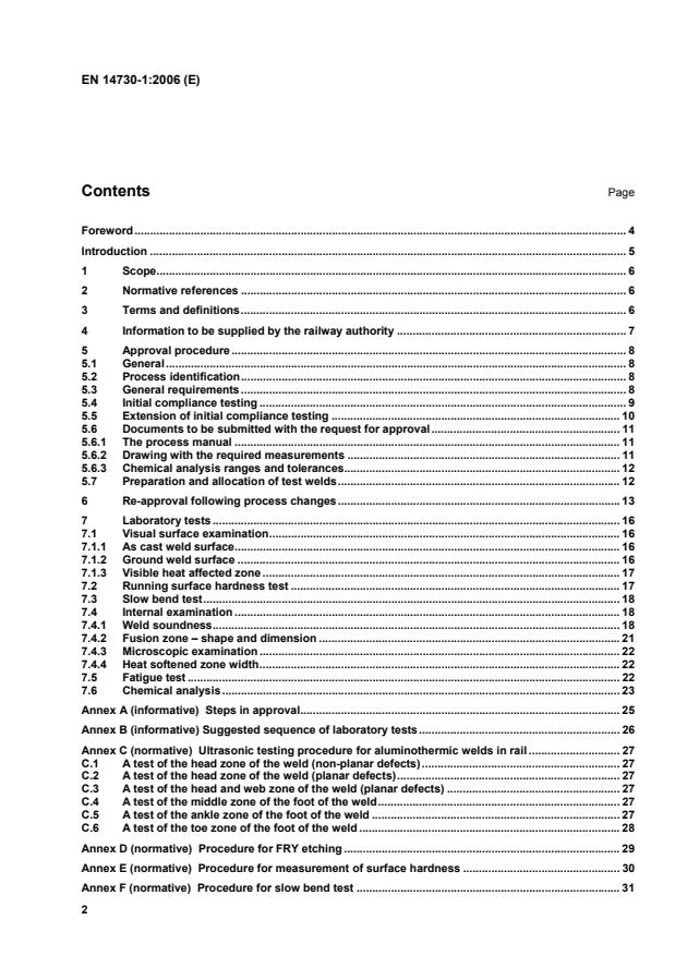 Ultrasonic testing procedure for aluminothermic welds in rail.27 C.1 A test of the head zone of the weld (non-planar defects).27 C.2 A test of the head zone of the weld (planar defects).27 C.3 A test of the head and web zone of the weld (planar defects).27 C.4 A test of the middle zone of the foot of the weld.27 C.5 A test of the ankle zone of the foot of the weld.27 C.6 A test of the toe zone of the foot of the weld.28 Annex D (normative)