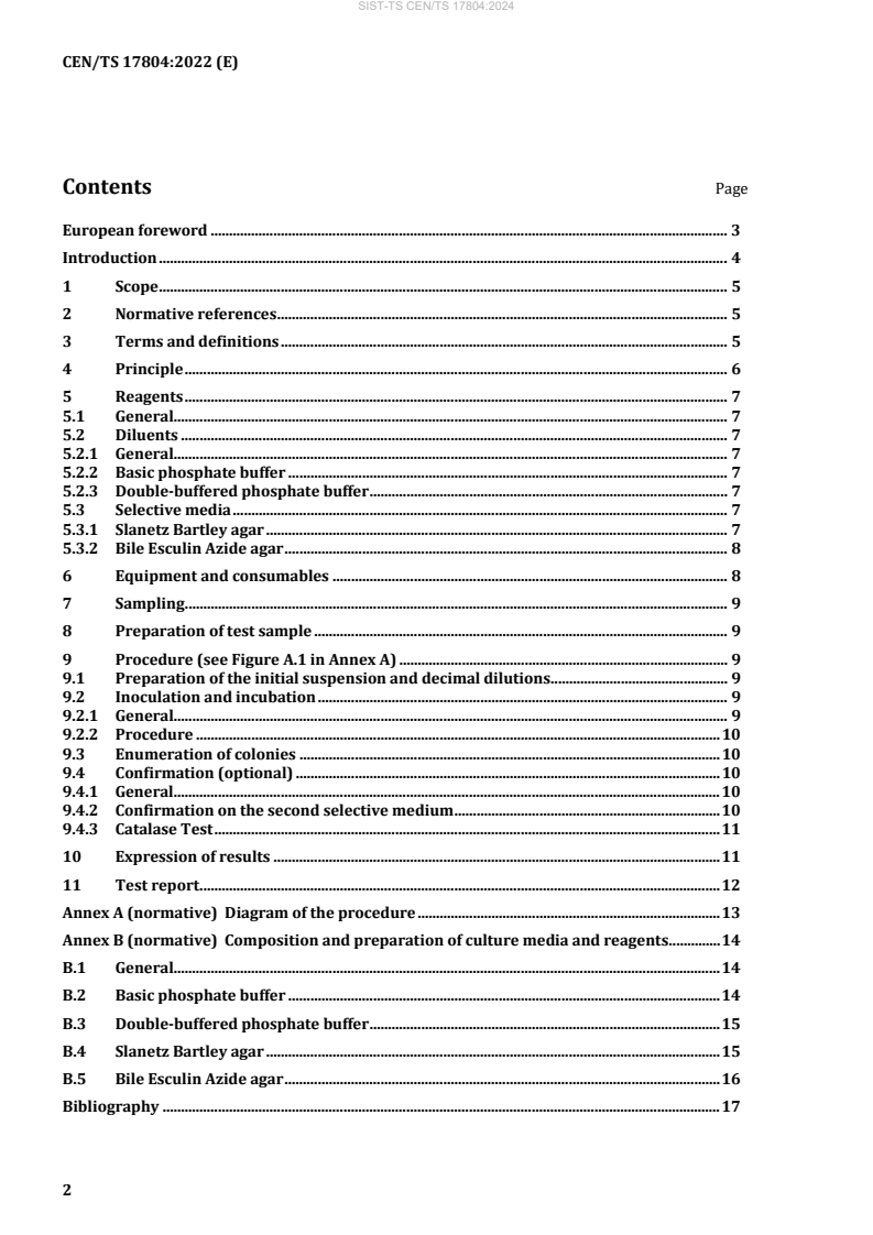 This document specifies a colony-count technique on selective media, Slanetz Bartley agar or Bile Esculin Azide agar, respectively. The method is based on EN ISO 7899 2:2000.