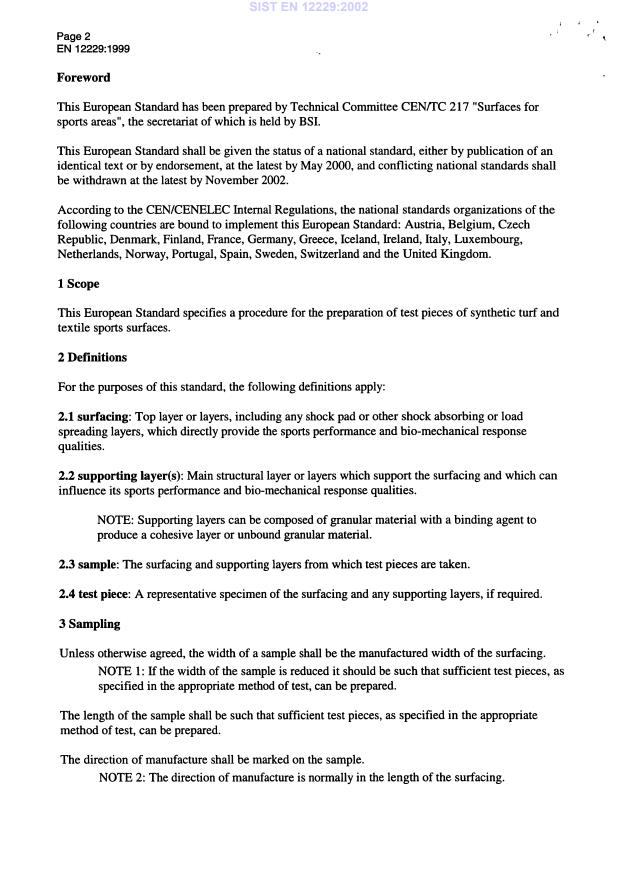 EN 12229:1999 is a standard published by the European Committee for Standardization (CEN). Its full title is "Surfaces for sports areas - Procedure for the preparation of synthetic turf and textile test pieces". This standard covers: This European Standard specifies a procedure for the preparation of test pieces of synthetic turf and textile sports surfaces.