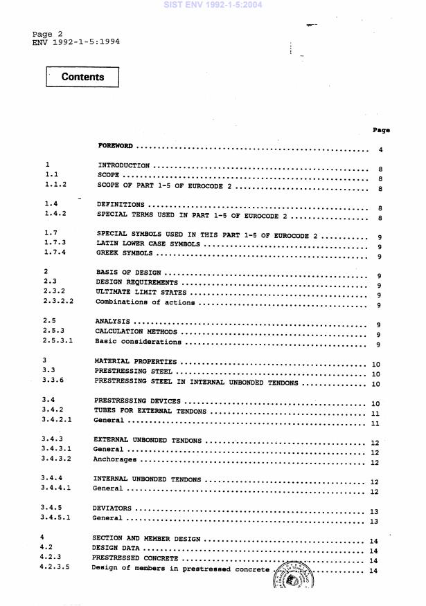 ENV 1992-1-5:1994 is a standardization document published by the European Committee for Standardization (CEN). Its full title is "Eurocode 2: Design of concrete structures - Part 1-5: General rules - Structures with unbonded and external prestressing tendons". This standard covers: Migrated from Progress Sheet (TC Comment) (2000-07-10): Splitting of WI 13. Dates refer to ENV. ++ 2-Y-Review (therefore re-use of old WI and use of stage 41).