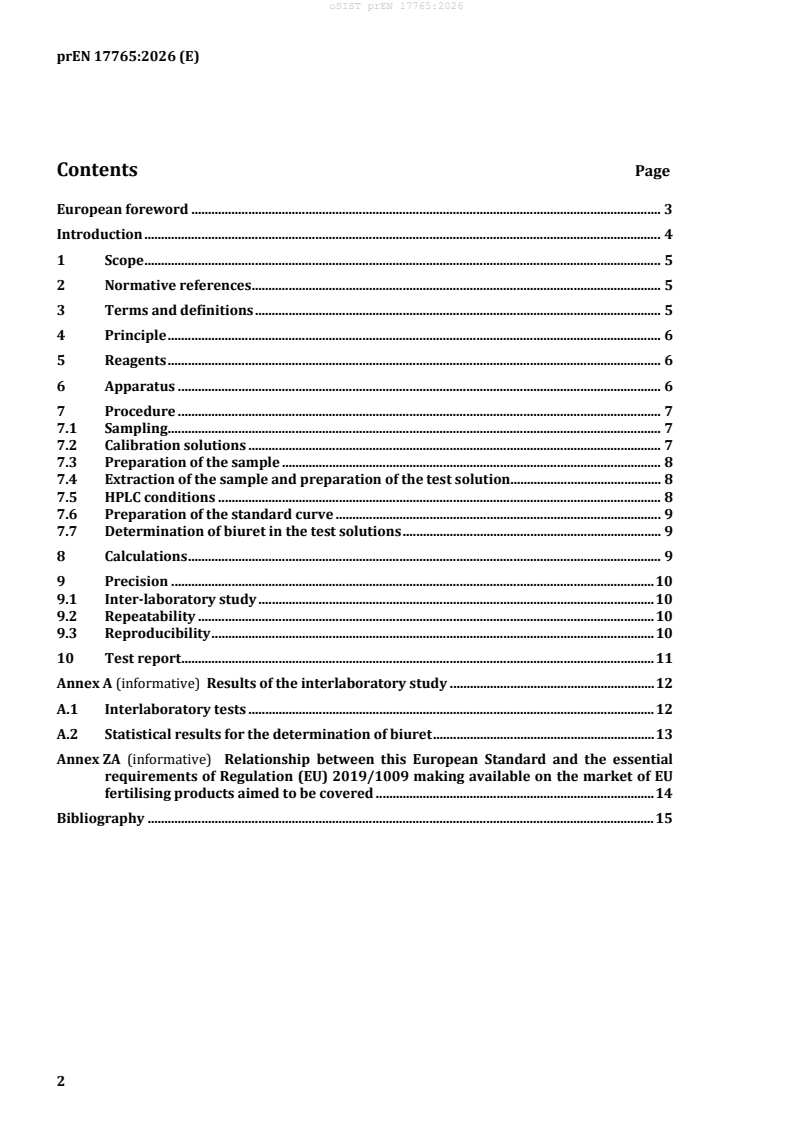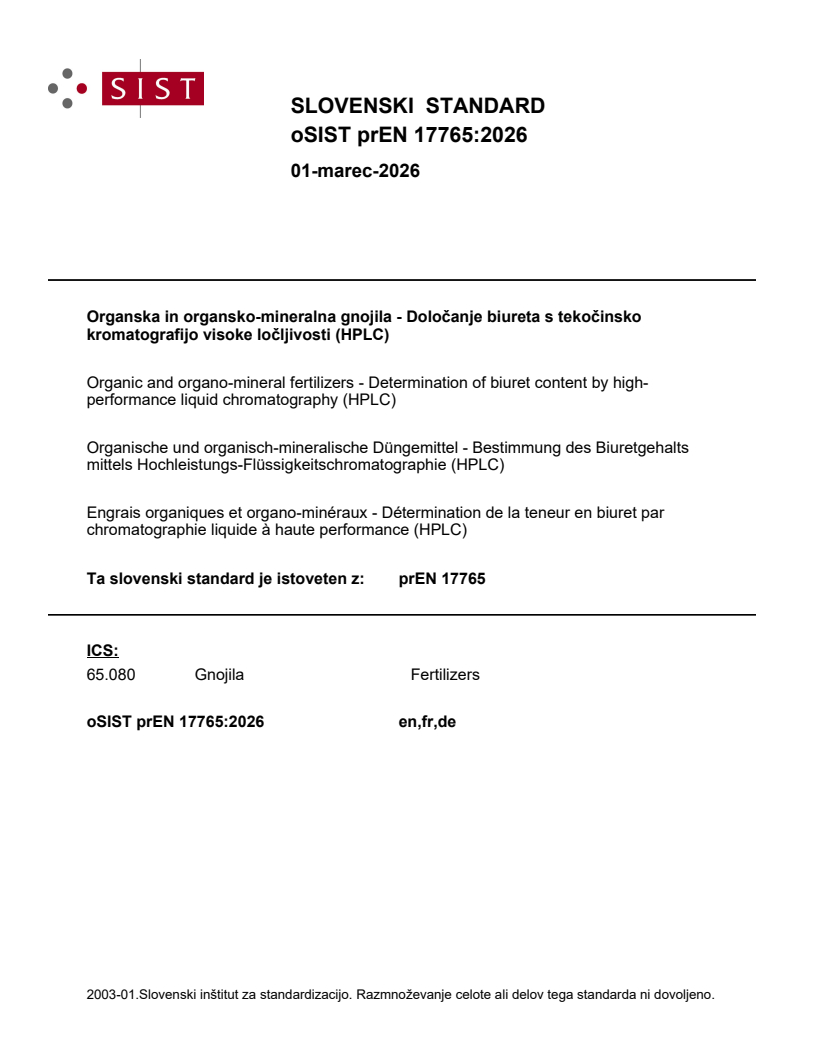 prEN 17765 is a draft published by the European Committee for Standardization (CEN). Its full title is "Organic and organo-mineral fertilizers - Determination of biuret content by high-performance liquid chromatography (HPLC)". This standard covers: This document specifies a method for the determination of the biuret content by high-performance liquid chromatography (HPLC) with ultraviolet (UV) detector. This document is applicable to organic and organo-mineral fertilizers containing urea. This document is applicable to fertilizing products blends where a blend is a mix of at least two of the following products: fertilizers, liming materials, soil improvers, growing media, inhibitors, plant biostimulants and where organic matter is present in at least one of the products in the blend. In case a fertilizing product blend is composed only of inorganic products, the European Standard for inorganic fertilizers applies. Variations in analytical methods for fertilizing product blends can lead to differing results as some components or matrix interactions can affect the outcome. Validation procedures have shown that developed standard methods are robust and reliable across diverse product compositions, but possible interferences and unexpected results when analysing fertilizing product blends are possible. NOTE 1 This method was tested only for one fertilizing product blend during the inter-laboratory study. The product tested was a liquid organo-mineral mixture of a liquid organic fertilizer, a growing medium and a non-microbial plant biostimulant. NOTE 2 Nowadays, there is a method standardized as EN 15479 that allows the determination of biuret in urea by spectrophotometric detection. Organic and organo-mineral fertilizers contain organic matter and other compounds apart from urea that would interfere in a spectrophotometric method. HPLC allows an accurate determination of biuret by separating it from possible interfering compounds [2] [5].