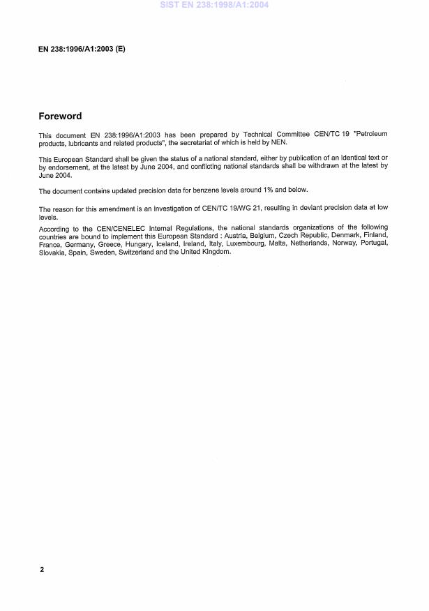 EN 238:1996/A1:2003 is a amendment published by the European Committee for Standardization (CEN). Its full title is "Liquid petroleum products - Petrol - Determination of the benzene content by infrared spectrometry". This standard covers: Updated precision data for benzene levels around 1% and below, as given in the Report of WG 9, doc. N 1108.