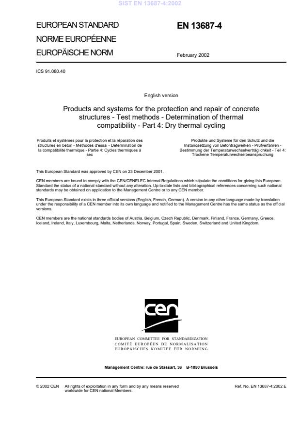 EN 13687-4:2002 (CEN) defines a standardized test method to determine the thermal compatibility of products and systems used for the protection and repair of concrete structures by means of dry thermal cycling. The scope covers repair grouts, mortars and concretes (CC, PCC, PC binders) and surface protection systems. The method measures effects of repeated temperature extremes in air (no de-icing salt or water exposure) and records visible defects and adhesion loss.