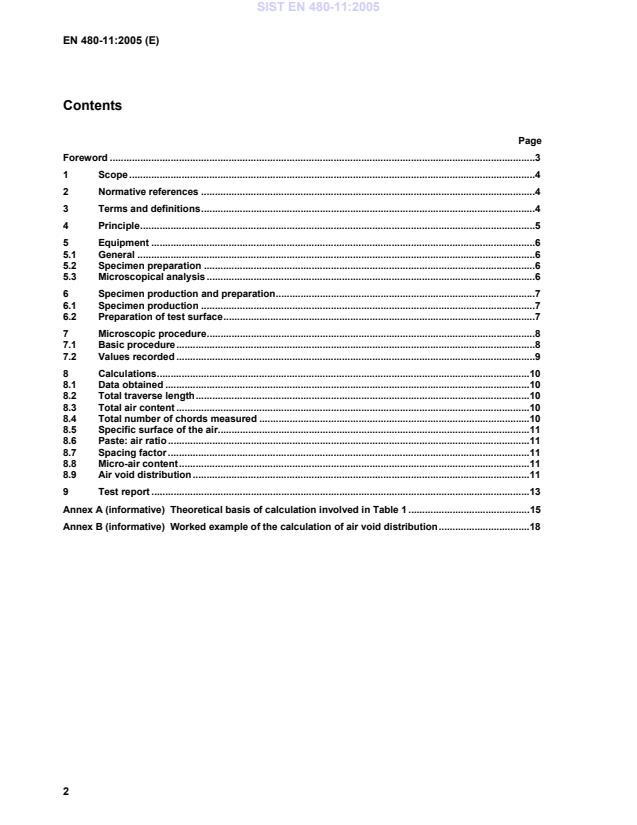 EN 480-11:2005 is a standard published by the European Committee for Standardization (CEN). Its full title is "Admixtures for concrete, mortar and grout - Test methods - Part 11: Determination of air void characteristics in hardened concrete". This standard covers: This European Standard describes a test method for determination of the air- void structure in a hardened concrete sample which contains entrained air. The air-void structure is described by means of the following parameters, which are defined in clause 3. i) Total air content, ii) Specific surface of air void system, iii) Spacing factor, iv) Air-void size distribution, v) Micro air content.