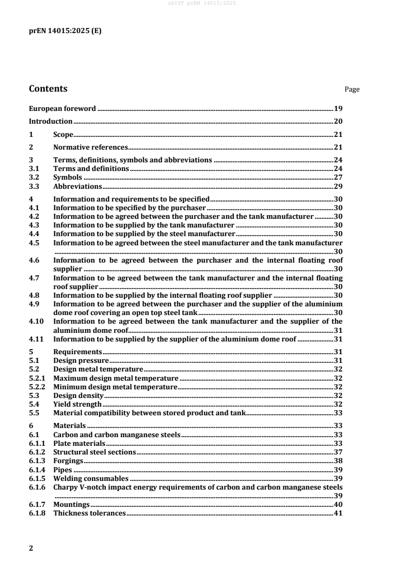 prEN 14015 is the CEN draft specification for the structural design and manufacture of site-built, vertical, cylindrical, flat-bottomed, above-ground welded steel tanks for storing liquids at ambient temperature and above. It specifies requirements covering materials, design, fabrication, erection, testing and inspection of the basic tank structure. The standard is intended to be used together with EN 1993-4-2 and aligns with Eurocode principles for structural performance and serviceability.