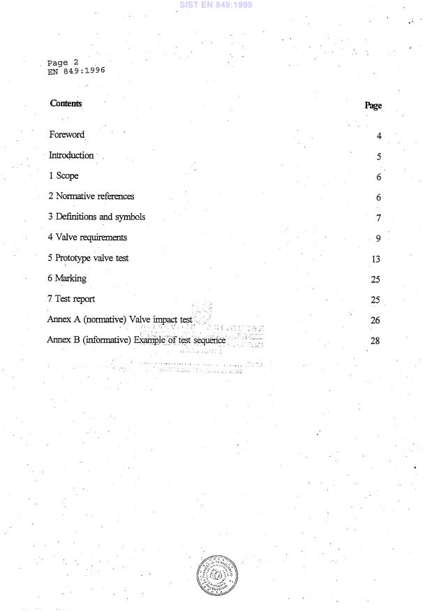 EN 849:1996 is a standard published by the European Committee for Standardization (CEN). Its full title is "Transportable gas cylinders - Cylinder valves - Specification and type testing". This standard covers: This European Standard specifies requirements for gas cylinder valves and the method of testing such valves, for type approval. This standard is applicable to valves to be fitted to gas cylinders, up to 150 l water capacity, intended to convey compressed, liquefied or dissolved gases. This standard is only applicable to valves operated by a hand wheel or a key. This standard is not applicable to valves for breathing equipment, fire extinguishers, cryogenic equipment or liquefied petroleum gas (LPG).