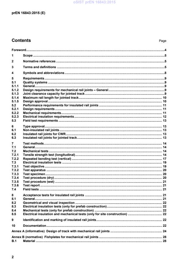 prEN 16843 is a draft published by the European Committee for Standardization (CEN). Its full title is "Railway applications Infrastructure - Mechanical requirements for joints in running rails". This standard covers: This European Standard deals with mechanical rail joints for flat bottom rails 46 kg/m and over. The scope of this standard is: to establish requirements for insulated and noninsulated rail joints, for stressed rail (continuous welded rail, CWR) and unstressed rail (jointed track); to define mechanical and electrical requirements for type approval and for acceptance of insulated rail joints which are manufactured in a factory (prefab construction) as well as assembled onsite (site construction). This standard specifies the minimum requirements. Special applications as for instance tram systems may require different demands in certain paragraphs and should be agreed between customer and supplier. The scope also excludes expansion joints (it is covered in EN 132328), and special joints in switch constructions.