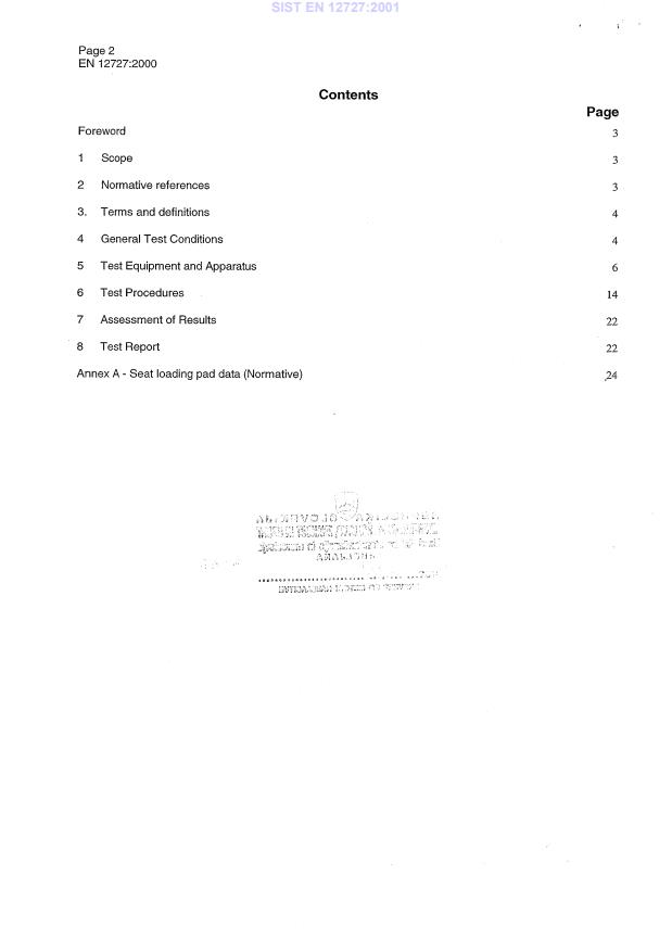 EN 12727:2000 is a standard published by the European Committee for Standardization (CEN). Its full title is "Furniture - Ranked seating - Test methods and requirements for strength and durability". This standard covers: This European Standard specifies test methods and requirements determining the structural stength and durability of the structure of all types of ranked seating, (e.g. stadium and auditorium seating) which are permanently fastened to the floor and/or walls, whether in bench or individual seat form. A table of tests with four choices of loads is included. This standard applies to seating permanently fixed in ranks but does not apply to linked upright chairs not fastened to the floor and/or walls. Assessment of ageing, degradation and the effect of ambient temperature are not included.