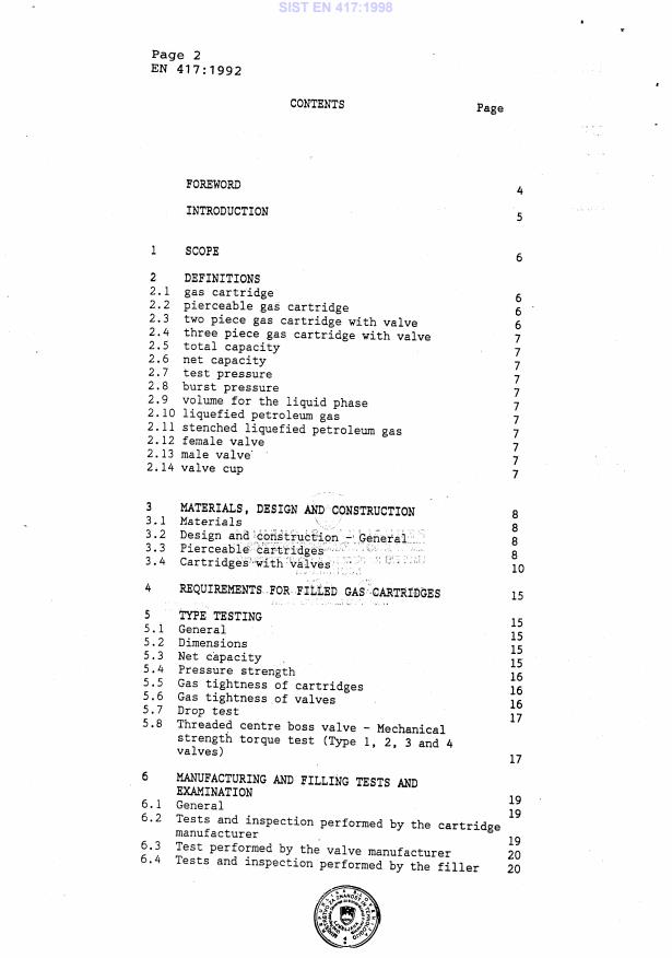 EN 417:1992 is a standard published by the European Committee for Standardization (CEN). Its full title is "Non-refillable metallic gas cartridges for liquefied petroleum gases, with or without a valve, for use with portable appliances - Construction, inspection, testing and marking". This standard covers: This European standard specifies material, construction, inspection and marking requirements for non-refillable metallic gas cartridges with or without a valve for use with portable appliances which comply with the requirements of EN 521 "Portable appliances operating at vapour pressure from liquiefied petroleum gas containers". 1).