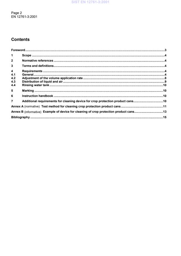 Page 2EN 12761-3:2001ContentsForeword.31Scope.42Normative references.43Terms and definitions.44Requirements.44.1General.44.2Adjustment of the volume application rate.84.3Distribution of liquid and air.94.4Rinsing water tank.105Marking.106Instruction handbook.107Additional requirements for cleaning device for crop protection product cans.10Annex A (normative)