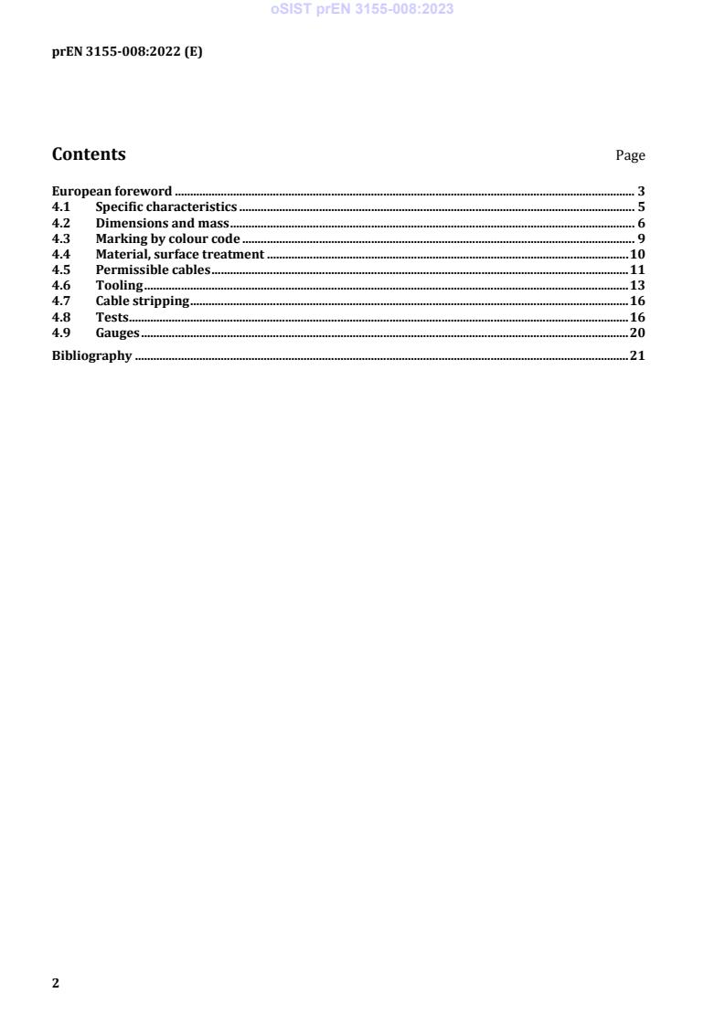 This document specifies the required characteristics, tests and tooling applicable to male electrical contacts 008, type A, crimp, class S, used in elements of connection according to EN 3155-002. It is used together with EN 3155-001. The associated female contacts are specified in EN 3155-003 and EN 3155-009.