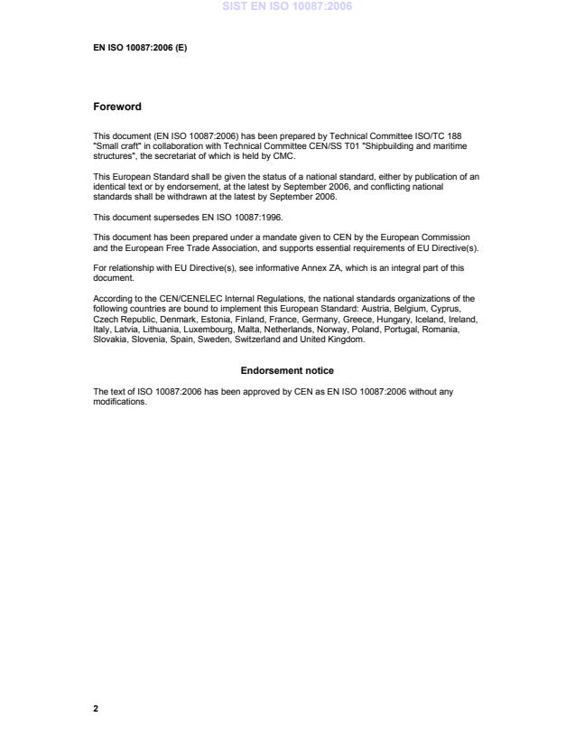 EN ISO 10087:2006 is a standard published by the European Committee for Standardization (CEN). Its full title is "Small craft - Craft identification - Coding system (ISO 10087:2006)". This standard covers: ISO 10087:2006 establishes a coding system to achieve identification of any small craft in terms of identification code of the country of the manufacturer; identification code of the manufacturer; serial number; month and year of manufacture; model year. It applies to small craft of all types and materials, of hull length up to 24 m. It does not apply to beach or bathing toys.