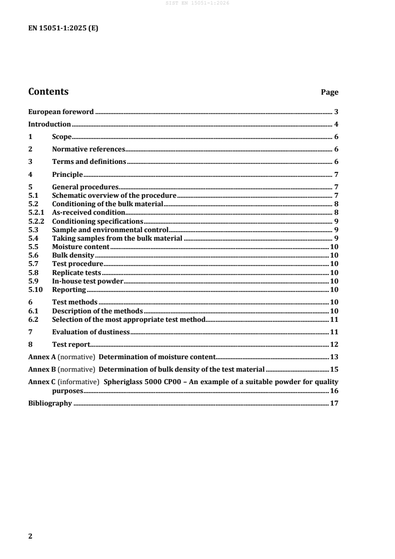 This document specifies the environmental conditions, the sample handling and analytical procedures and the method of calculating and presenting the results. Reasons are given for the need for more than one method and advice is given on the choice of method to be used. This document establishes a categorization scheme for dustiness to provide a standardized way to express and communicate the results to users of the bulk materials. Details of the scheme for each method are given in FprEN 15051-2:2025 and FprEN 15051-3:2025. This document is applicable to powdered, granular or pelletized bulk materials. This document does not apply to test the dust released during mechanical reduction of solid bulk materials (e.g. cut, crushed) or to test application procedures for the bulk materials.