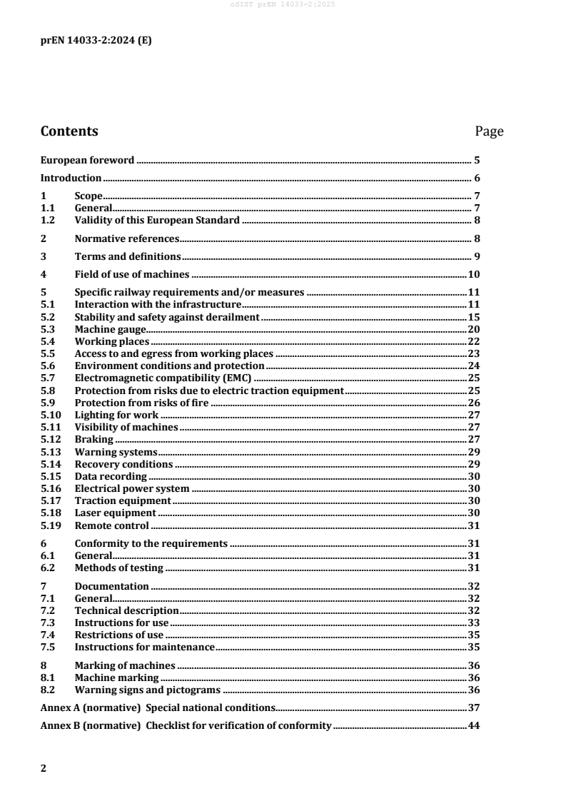 This document defines the specific technical railway requirements for travelling and working with railbound machines and other vehicles - referred to as machines - used for construction, maintenance and inspection of track, structures, track formation and fixed electric traction equipment as specified in prEN 14033 1:2024.