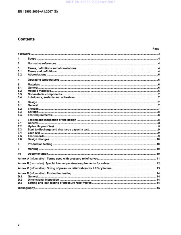 1 Scope This European Standard specifies the design, testing and marking requirements for spring loaded pressure relief valves, for use in liquefied petroleum gas (LPG) cylinders. These valves can be either an integral part of a cylinder valve (see EN 13152 and EN 13153) or a separate device. This European Standard does not exclude the use of other designs of pressure relief devices that provide a similar level of safety. 2 Normative references This European Standard incorporates by dated or undated reference, provisions from other publications. These normative references are cited at the appropriate places in the text and the publications are listed hereafter. For dated references, subsequent amendments to or revisions of any of these publications apply to this European Standard only when incorporated in it by amendment or revision. For undated references the latest edition of the publication referred to applies (including amendments). EN 549, Rubber materials for seals and diaphragms for gas appliances and gas equipment EN 751 (all parts), Sealing materials for metallic threaded joints in contact with 1st, 2nd and 3rd family gases and hot water EN 837-1, Pressure gauges – Part 1: Bourdon tube pressure gauges - Dimensions, metrology, requirements and testing EN 1563, Founding – Spheroidal graphite cast irons EN 10270-3, Steel wire for mechanical springs – Part 3: Stainless spring steel wire EN 12164, Copper and copper alloys – Rod for free machining purposes EN 12420, Copper and copper alloys – Forgings EN 13906-1, Cylindrical helical springs made from round wire and bar – Calculation and design – Part 1: Compression springs 3 Terms, definitions and abbreviations 3.1 Terms and definitions For the purposes of this European Standard, the following terms and definitions apply: 3.1.1 LPG mixture of light hydrocarbons, gaseous under standard atmospheric conditions, which can be liquefied by increased pressure or decreased temperature. The main components are propane, propene, butane and butene isomers 3.1.2 pressure relief valve valve which automatically, without the assistance of any energy other than that of the fluid concerned, discharges a quantity of fluid so as to prevent a predetermined safe pressure being exceeded, and which is designed to re-close and prevent the further flow of fluid after normal pressure conditions of service have been restored. The loading due to the fluid pressure underneath the valve-sealing element is opposed by a spring SIST EN 13953:2003+A1:2007