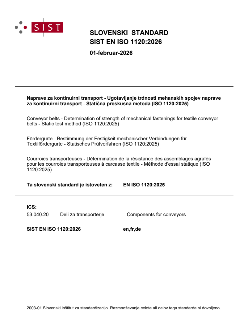 EN ISO 1120:2025 is a standard published by the European Committee for Standardization (CEN). Its full title is "Conveyor belts - Determination of strength of mechanical fastenings for textile conveyor belts - Static test method (ISO 1120:2025)". This standard covers: This document specifies a static test method for measuring the strength of a conveyor belt mechanical fastening; the mechanical joints can be either of the type employing a connecting rod or of a type which does not employ a connecting rod. This document does not cover vulcanized joints. This document is neither applicable to nor valid for light conveyor belts, as described in ISO 21183-1. NOTE The purpose of the test specified in this document is to eliminate mechanical fastenings of insufficient static strength. It is intended to establish a dynamic test at a later date.