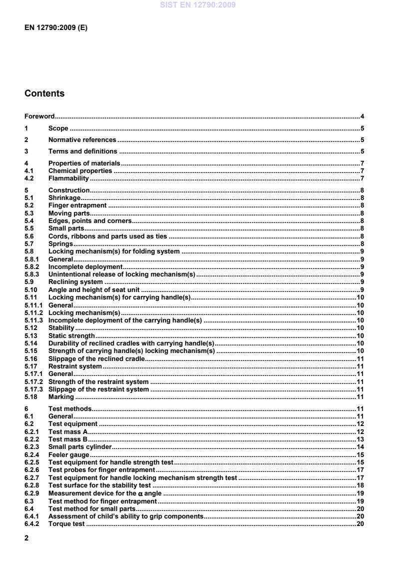 This standard does not apply to reclined cradles when used as swings. If a reclined cradle has several functions or can be converted into another function the relevant European standards apply to it (see Annex B). 2 Normative references The following referenced documents are indispensable for the application of this document. For dated references, only the edition cited applies. For undated references, the latest edition of the referenced document (including any amendments) applies. EN 71-1, Safety of toys – Part 1: Mechanical and physical properties EN 71-3, Safety of toys – Part 3: Migration of certain elements EN 1103, Textiles – Fabrics for apparel – Detailed procedure to determine the burning behaviour EN ISO 868, Plastics and ebonite – Determination of indentation hardness by means of a durometer (Shore hardness) (ISO 868:2003) ISO 48, Rubber, vulcanized or thermoplastic – Determination of hardness (hardness between 10 IRHD and 100 IRHD) ISO 7619-1, Rubber, vulcanized or thermoplastic – Determination of indentation hardness – Part 1: Durometer method (Shore hardness) ISO 7619-2, Rubber, vulcanized or thermoplastic – Determination of indentation hardness – Part 2: IRHD pocket meter method 3 Terms and definitions For the purposes of this standard, the following terms and definitions apply. 3.1 reclined cradle article intended to accommodate a child in a reclined position NOTE Reclined cradles may be static, rocking or bouncing and may have an adjustable backrest and/or seat. 3.1.1 static reclined cradle article not intended to bounce or rock 3.1.2 rocking reclined cradle article intended to allow the child to rock SIST EN 12790:2009