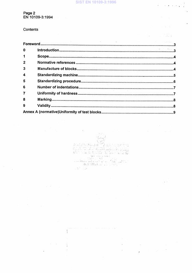 EN 10109-3:1994 is a standard published by the European Committee for Standardization (CEN). Its full title is "Metallic materials - Hardness test - Part 3: Calibration of standardized blocks to be used for Rockwell hardness testing machines (scales A,B,C,D,E,F,G,H,K,N,T)". This standard covers: This Draft European Standard specifies a method for the calibration of standardized blocks to be used in Rockwell hardness testing machines (scales A, B,C,D,E,F,G,K,N,T) for the indirect verification of these machines, as described in EN 10109-2. The normative annex A shows the uniformity requirements of the standardized blocks diagrammatically.