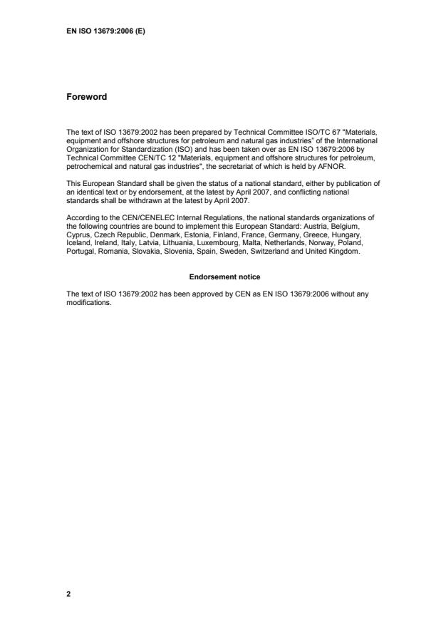 EN ISO 13679:2006 is classified under the following ICS (International Classification for Standards) categories: 75.180.10 - Exploratory, drilling and extraction equipment; 75.200 - Petroleum products and natural gas handling equipment. The ICS classification helps identify the subject area and facilitates finding related standards.