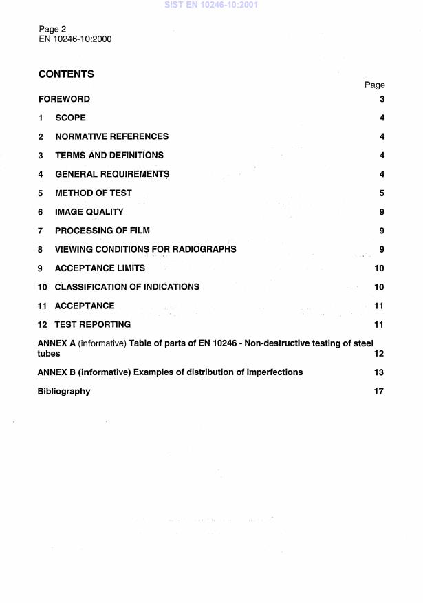 This Part of EN 10246 specifies the requirements for radiographic X-ray testing of the longitudinal or helically weld seams of automatic fusion arc-welded steel tubes for the detection of imperfections. The standard specifies acceptance levels and calibration procedures. European Standard EN 10246 "Non-destructive testing of steel tubes" comprises the parts shown in Annex A.