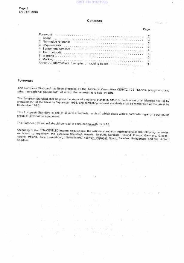 EN 916:1996 is a standard published by the European Committee for Standardization (CEN). Its full title is "Gymnastic equipment - Vaulting boxes - Functional and safety requirements, test methods". This standard covers: This standard specifies functional requirements and specific safety requirements in addition to the general safety requirements in prEN 913. This standard is applicable to five types of vaulting boxes.