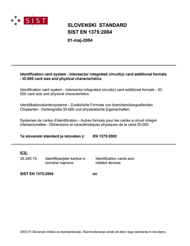 2003-01.Slovenski inštitut za standardizacijo. Razmnoževanje celote ali delov tega standarda ni dovoljeno.Identification card system - Intersector integrated circuit(s) card additional formats - ID-000 card size and physical characteristicsIdentifikationskartensysteme - Zusätzliche Formate von branchenübergreifenden Chipkarten - Kartengröße ID-000 und physikalische EigenschaftenSystemes de cartes d'identification - Autres formats pour les cartes a circuit intégré intersectorielles - Dimensions et caractéristiques physiques de la carte ID-000Identification card system - Intersector integrated circuit(s) card additional formats - ID-000 card size and physical characteristics35.240.15Identifikacijske kartice in sorodne napraveIdentification cards and related devicesICS:Ta slovenski standard je istoveten z:EN 1375:2002SIST EN 1375:2004en01-maj-2004SIST EN 1375:2004SLOVENSKI