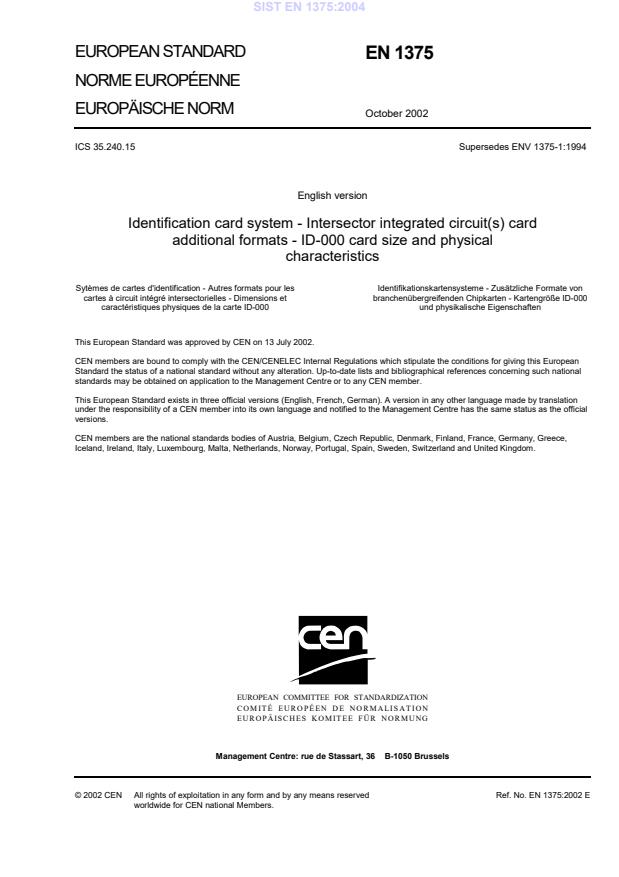 EN 1375:2002 is a standard published by the European Committee for Standardization (CEN). Its full title is "Identification card system - Intersector integrated circuit(s) card additional formats - ID-000 card size and physical characteristics". This standard covers: This European Standard defines an ICC format in addition to already standardized ID-1 format. ID-000 format may be derived from ID-1 format as shown in the annex B. This Standard specifies physical characteristics as well as dimensions, locations and assignment of the contacts of cards with integrated circuit(s) plus the related test methods.