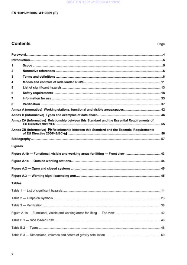 !!!!Relationship between this Standard and the Essential Requirements of EU Directive 2006/42/EC"""" . 56Bibliography . 57Figures Figure A.1b — Functional, visible and working areas for lifting — Front view . 43 Figure A.1c — Outside working stations. 44 Figure A.2 — Open and closed systems . 45 Figure A.3 — Warning sign : extending arm . 45 Tables Table 1 — List of significant hazards . 14Table 2 — Graphical symbols . 23Table 3 — Verification. 38Figure A.1a — Functional, visible and working areas for lifting — Top view . 42Table B.1 — Side loaded RCV . 46Table B.2 — Types . 48Table B.3 — Dimensions, volumes and centre of gravity calculation . 50SIST EN 1501-2:2005+A1:2010