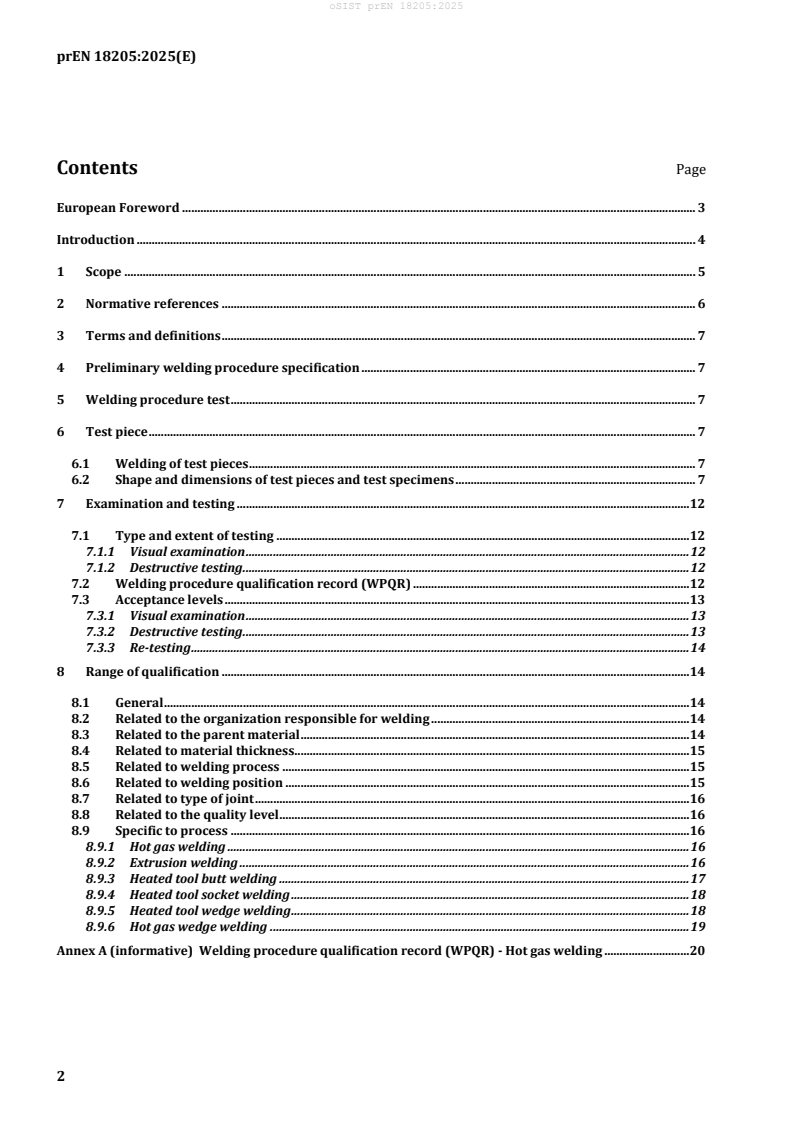 prEN 18205 is a draft published by the European Committee for Standardization (CEN). Its full title is "Qualification of Welding Procedures for Plastic Materials". This standard covers: This document specifies a procedure to qualify a preliminary welding procedure specification (pWPS) by welding procedure tests to produce a qualified welding procedure specification (WPS). This document applies to the following thermoplastic welding processes: hot gas welding: round nozzle, speed, wedge; extrusion welding; heated tool welding: butt, socket, wedge. The document applies to the welding of the following products: sheet, pipe (unreinforced, solid wall only); fittings (unreinforced only); lining membrane. This document covers the welding of the following groups of materials: a) for sheets, pipes and fittings: PVC (including all kinds of PVC-U, PVC-C) and ABS; PP; PE; PVDF; ECTFE, PFA and FEP; b) for lining membranes: PVC-P; PE; ECB;PP; c) for pipes and fittings only: PA-U 11 and PA-U 12