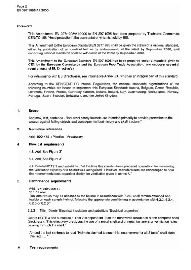 EN 397:1995/A1:2000 is a amendment published by the European Committee for Standardization (CEN). Its full title is "Industrial safety helmets". This standard covers: Add new, last, sentence - "Industrial safety helmets are intended primarily to provide protection to the wearer against falling objects and consequential brain injury and skull fracture".