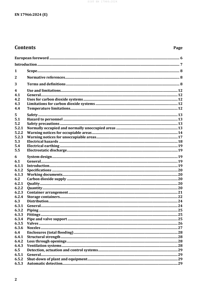 EN 17966:2024 - Fire protection equipment: Carbon dioxide extinguishing systems for use on premises - Design and installation (ISO 6183:2022, modified) - is a European standard published by CEN (approved 5 August 2024). It specifies requirements and guidance for the design, installation, testing, maintenance and safety of fixed carbon dioxide (CO2) firefighting systems in buildings, plants and other structures. The standard excludes systems on ships, aircraft, vehicles, mobile fire appliances, below-ground mining systems and CO2 pre-inerting systems. Special guidance is provided where protected volumes have unclosable openings or are subject to wind (see clause 7.4.3.2).