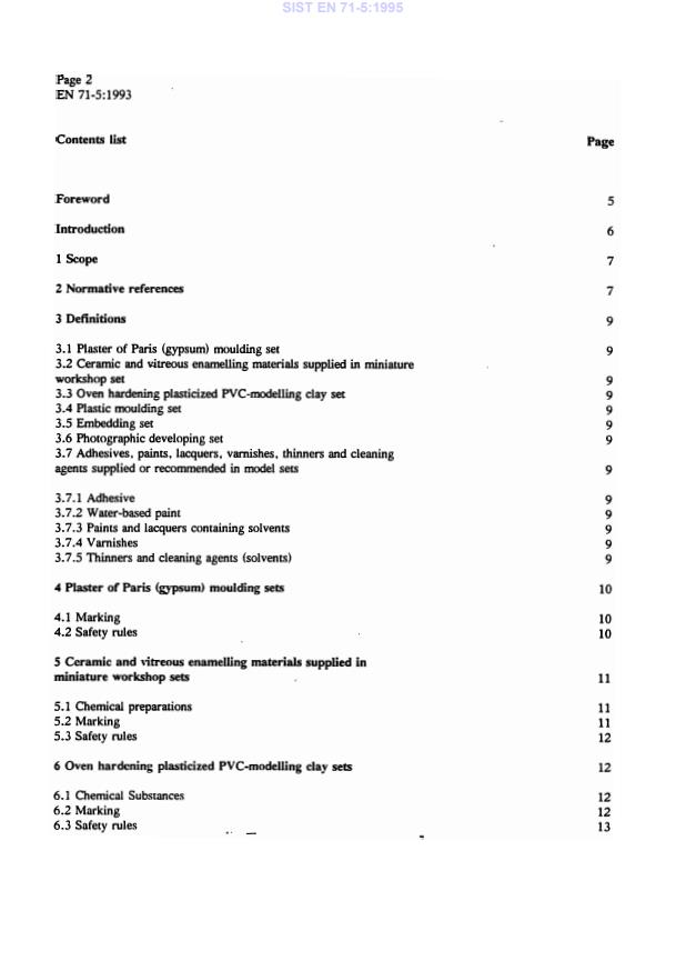 EN 71-5:1993 is a standard published by the European Committee for Standardization (CEN). Its full title is "Safety of toys - Part 5: Chemical toys (sets) other than experimental sets". This standard covers: This part of EN 71 specifies requirements for the substances and materials used in chemical toys (sets) other than experimental sets. It specifies: - the maximum amounts of substances and preparations classified as dangerous by the definitions in Directives 67/548/EEC* (with subsequent amendments and adaptations) and 88/379/EEC* (with subsequent amendments and adaptations); and - the maximum amounts of substances and preparations which in excessive amounts may harm the health of children using them and which are not covered by the above mentioned Directives; and - the maximum amounts for other substances or preparations delivered with the toy. Additionally, requirements are specified for markings, warnings, safety rules, contents lists, instructions for use and first aid information. This part of EN 71 applies to: - plaster of Paris (gypsum) moulding sets; - ceramic and vitreous enamelling materials supplied in miniature workshop sets; - oven hardening plasticized PVC modelling clay sets; - plastic moulding sets; - embedding sets; - photographic developing sets; - adhesives, paints, lacquers, varnishes, thinners and cleaning agents (solvents), supplied or recommended in model sets. * Differing legal requirements may exist in non-EC countries
