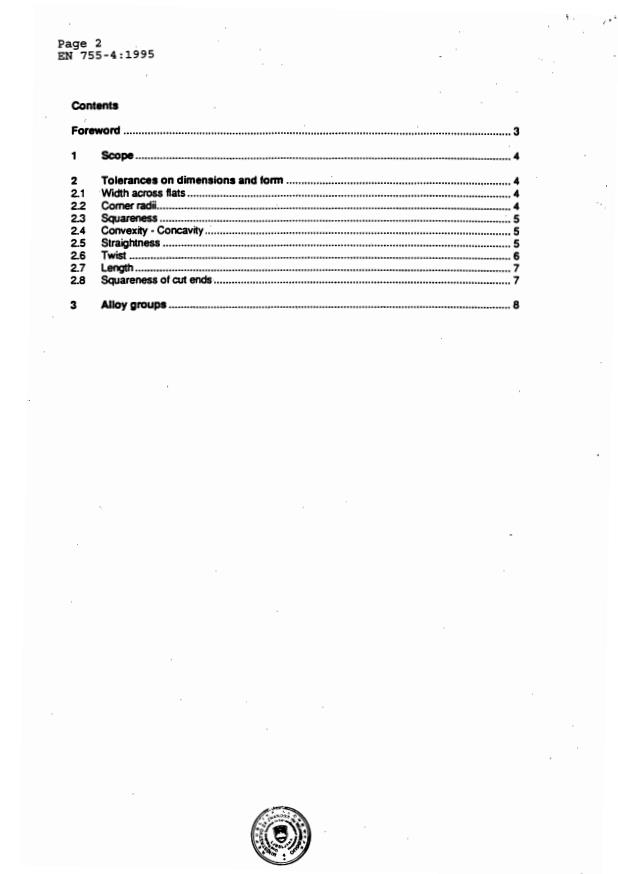 EN 755-4:1995 is a standard published by the European Committee for Standardization (CEN). Its full title is "Aluminium and aluminium alloys - Extruded rod/bar, tube and profiles - Part 4: Square bars, tolerances on dimensions and form". This standard covers: This part of EN 755 specifies the tolerances on dimensions and form for aluminium and aluminium alloy extruded square bars having widths across flats from 10 mm up to 220 mm.