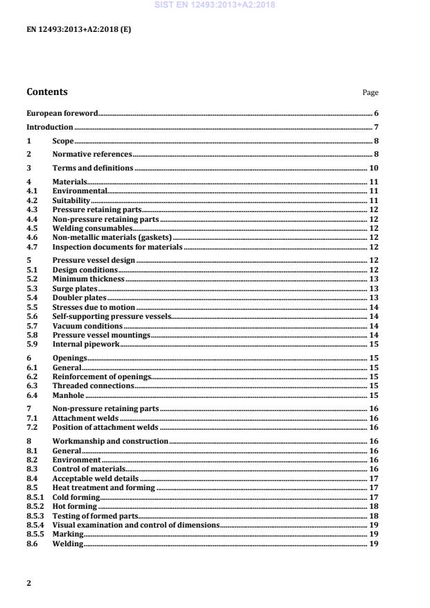 NOTE 4 This standard is intended for LPG only; however for other liquefied gases see EN 14025.$ 2 Normative references The following documents, in whole or in part, are normatively referenced in this document and are indispensable for its application. For dated references, only the edition cited applies. For undated references, the latest edition of the referenced document (including any amendments) applies. #deleted text$ EN 837-2, Pressure gauges — Part 2: Selection and installation recommendations for pressure gauges EN 10025-2, Hot rolled products of structural steels — Part 2: Technical delivery conditions for non-alloy structural steels EN 10028-2, Flat products made of steels for pressure purposes — Part 2: Non-alloy and alloy steels with specified elevated temperature properties EN 10028-3, Flat products made of steels for pressure purposes — Part 3: Weldable fine grain steels, normalized EN 10204:2004, Metallic materials — Types of inspection documents EN 12252, LPG equipment and accessories — Equipping of LPG road tankers EN 13445-2, Unfired pressure vessels — Part 2: Materials EN 13445-3, Unfired pressure vessels — Part 3: Design EN 14717, Welding and allied processes — Environmental check list EN ISO 148-1, Metallic materials — Charpy pendulum impact test — Part 1: Test method (ISO 148-1) EN ISO 3452-1, Non-destructive testing — Penetrant testing — Part 1: General principles (ISO 3452-1) SIST EN 12493:2013+A2:2018