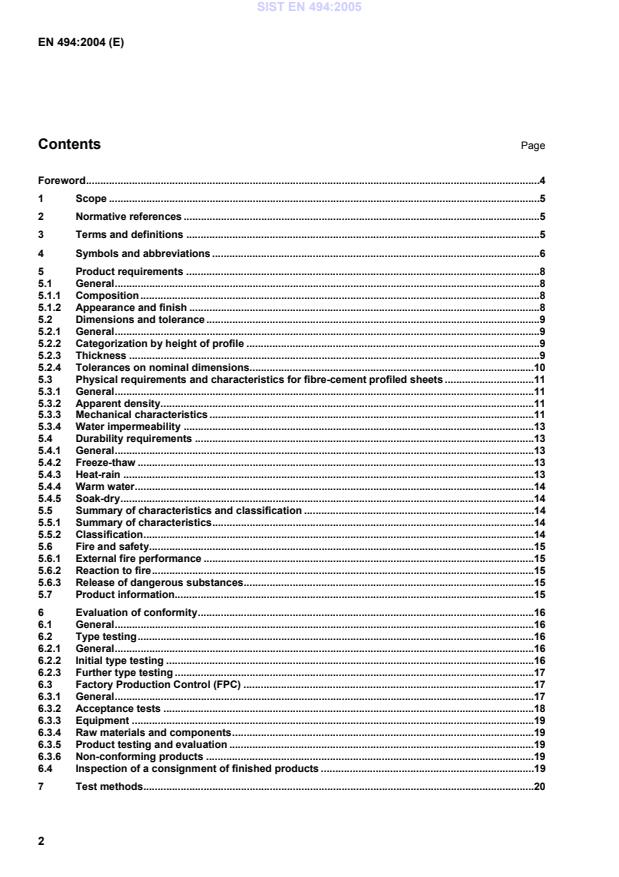 EN 494:2004 is a standard published by the European Committee for Standardization (CEN). Its full title is "Fibre-cement profiled sheets and fittings - Product specification and test methods". This standard covers: This document specifies the technical requirements and establishes methods of control and test as well as acceptance conditions for fibre-cement profiled sheets and their fibre-cement fittings for one or more of the following uses: - roofing, - internal wall finishes, - external wall and ceiling finishes. For the purpose of this document fibre-cement profiled sheets are classified according to their height of corrugation and their mechanical characteristics. This document covers fibre-cement profiled sheets reinforced with fibres of different type as specified in 5.1.1, with and without factory applied coating. This document does not include calculations with regard to works, design requirements, installation techniques, wind uplift or rain proofing of the installed sheets. NOTE Some of these requirements can be applied to curved sheets, after agreement between manufacturer and purchaser.