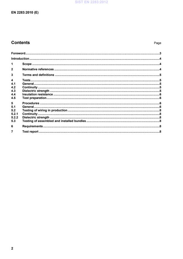 EN 2283:2010 is a standard published by the European Committee for Standardization (CEN). Its full title is "Aerospace series - Testing of aircraft wiring". This standard covers: This European Standard specifies: - the tests for finished wiring, including connectors and, if necessary, terminals, terminal ends, junction boxes, circuit breakers, etc.; - these tests do not concern equipment installed in the aircraft (see operation of systems and do not apply to the wiring used instrumentation; - the requirements for verification of aircraft electrical wiring; - continuity of circuits; - dielectric strength; - insulation resistance.