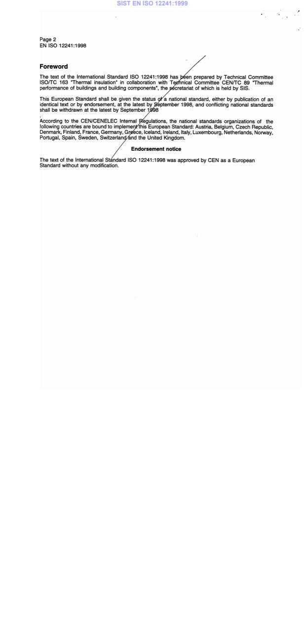 EN ISO 12241:1998 is a standard published by the European Committee for Standardization (CEN). Its full title is "Thermal insulation for building equipment and industrial installations - Calculation rules (ISO 12241:1998)". This standard covers: Fundamental formulae and methods typically used in the practical calculation of steady-state, one dimensional industrial heat flow variables; also included are simplified calculation methods for some variables. These methods can be applied to most types of industrial thermal insulation heat transfer problems. Do not take account permeation of air or transmittance of thermal radiation through transparent media, either in respect to surface of calculation or to surrounding surfaces. Mathematical formulae in these methods require for their solution that some system variables be known, given assumed, or measured.