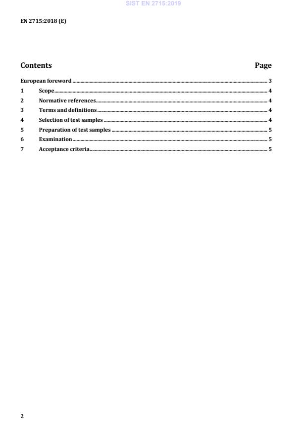 Page European foreword . 3 1 Scope . 4 2 Normative references . 4 3 Terms and definitions . 4 4 Selection of test samples . 4 5 Preparation of test samples . 5 6 Examination . 5 7 Acceptance criteria . 5