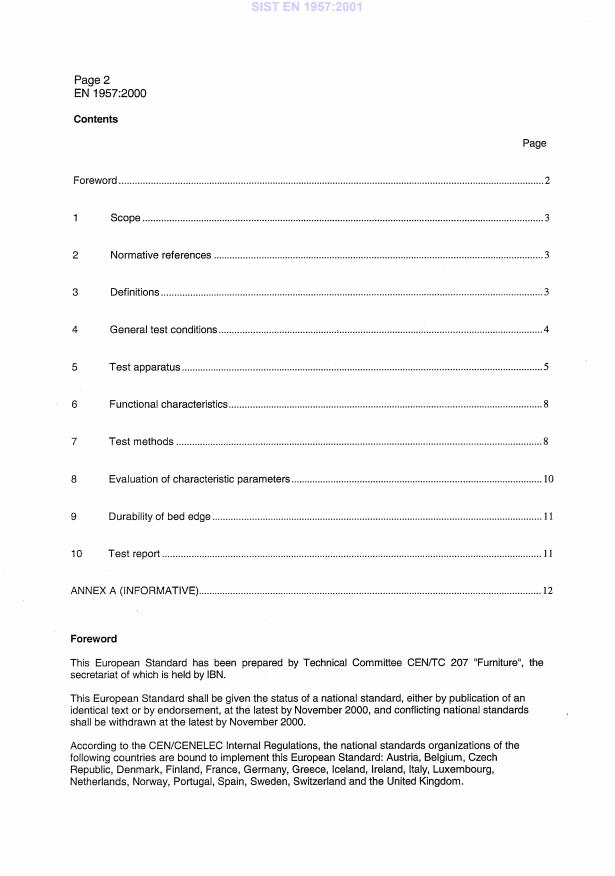 EN 1957:2000 is a standard published by the European Committee for Standardization (CEN). Its full title is "Domestic furniture - Beds and mattresses - Test methods for the determination of functional characteristics". This standard covers: This European standard specifies test methods for the determination of the durability and hardness of mattresses and all types of fully erected domestic beds with mattresses (and mattress pads when they form a unit with the mattress). It does not apply to water beds, air beds and children cots. It includes a method for the determination of the firmness rating of a mattress or a bed correlating to the subjective assessment made by people (see Annex A). It must be emphasized that the firmness rating cannot be used to demonstrate comfort and/or qualiy of a mattress or a complete bed.