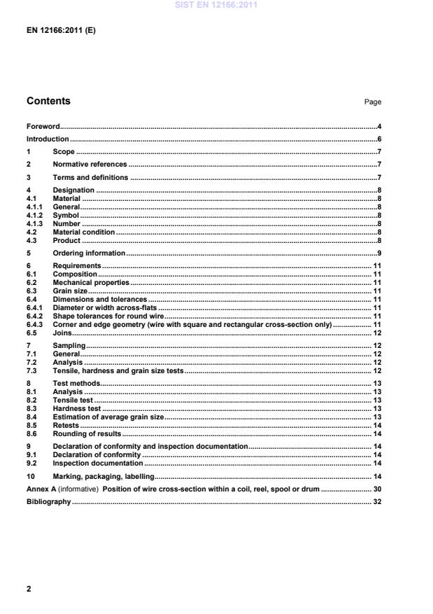 Material condition for a product which is stress relieved. G. Material condition designated by the mid-range value of grain size requirement for the product with mandatory grain size requirements (Table 13). NOTE The G. material condition is normally applicable only to round wires in the soft material condition made from alloys given in Tables 3, 4 and non-leaded alloys given in Table 2. Exact conversion between material conditions designated R., H. and G. is not possible. Except when the suffix S is used, material condition is designated by only one of the above designations. 4.3 Product The product designation provides a standardized pattern of designation from which a rapid and unequivocal description of a product is conveyed in communication. It provides mutual comprehension at the international level with regard to products which meet the requirements of the relevant European Standard. The product designation is no substitute for the full content of the standard. The product designation for products to this standard shall consist of: denomination (Wire); number of this European Standard (EN 12166); SIST EN 12166:2011